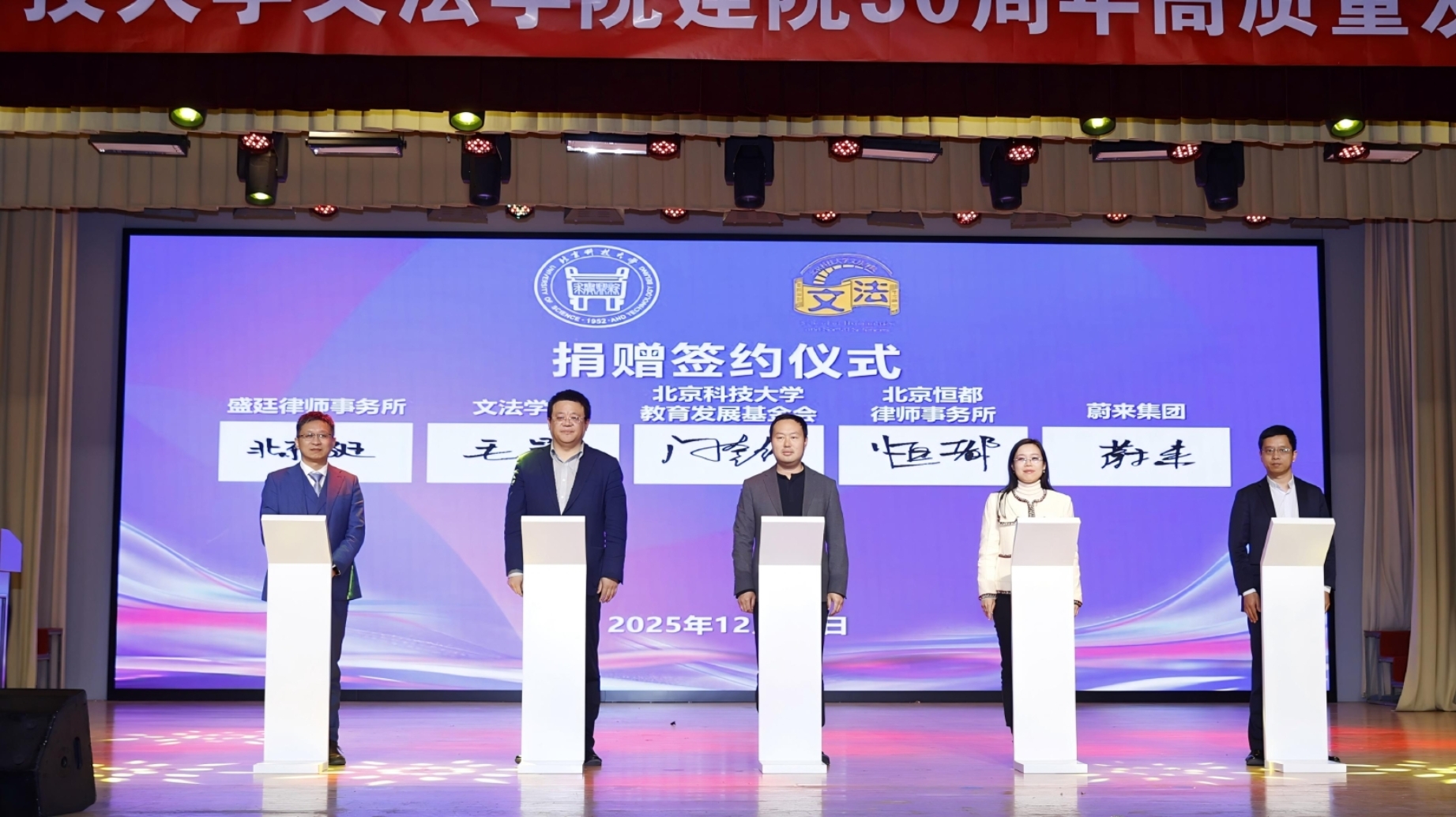 北京恒都律师事务所、盛廷律师事务所、蔚来法律创新研究院代表与学校校友会办公室、基金会办公室主任闫奎铭、成人a片 院长毛昊共同上台,启动捐赠合作仪式,携手为成人a片学科建设和人才培养提质增效。